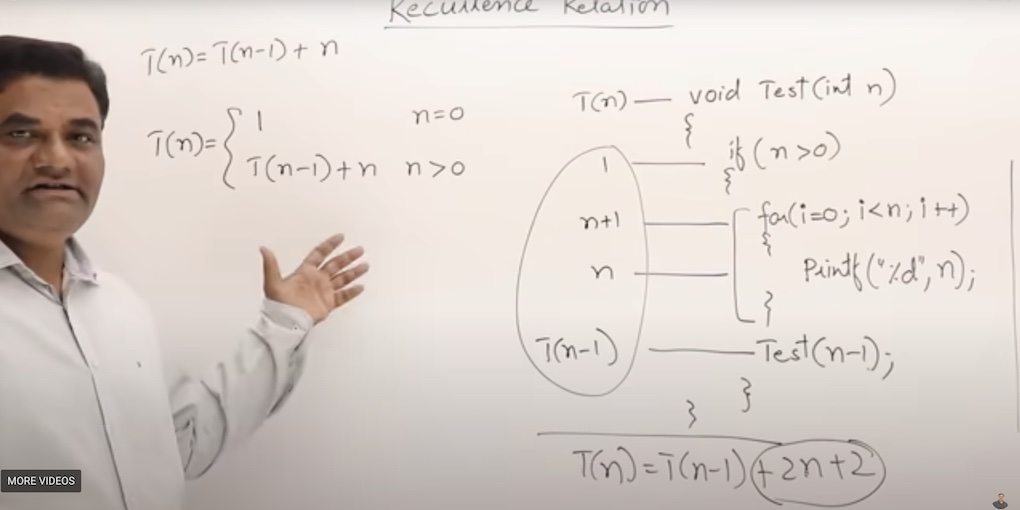 Discusses the recurrence relation, which is a mathematical notation to describe a sequence of values based on the previous term, which is useful for describing recursion and time complexity.