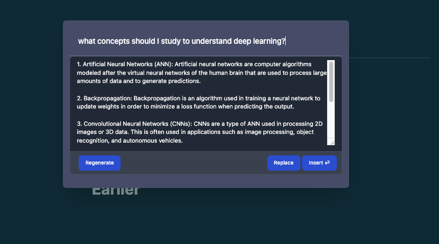 After you hit enter to run a command, the popup will show you a preview of the result from GPT-3, so you can decide if you want to insert the result into your notes.