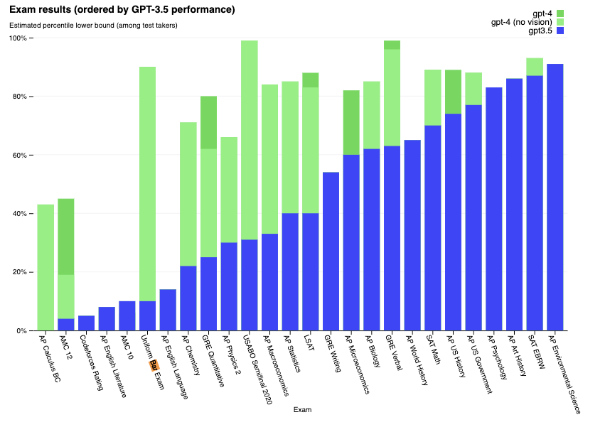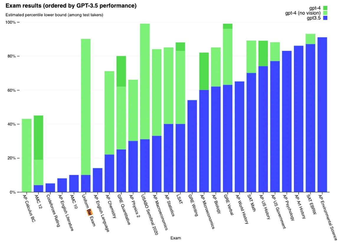 In OpenAI’s examples, they show it taking many human standardized tests like the AP Chemistry test and Bar Exam (that lawyers need to pass to practice law)