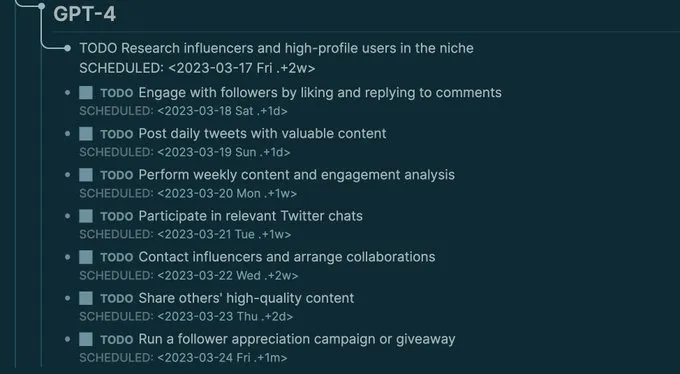 With GPT-4, you can give it one example of the Logseq task syntax, along with a command like “Create a plan for me to gain followers on Twitter using Logseq repeating tasks”, and it will generate a detailed plan of what tasks you need to do and how frequently you need to do them.