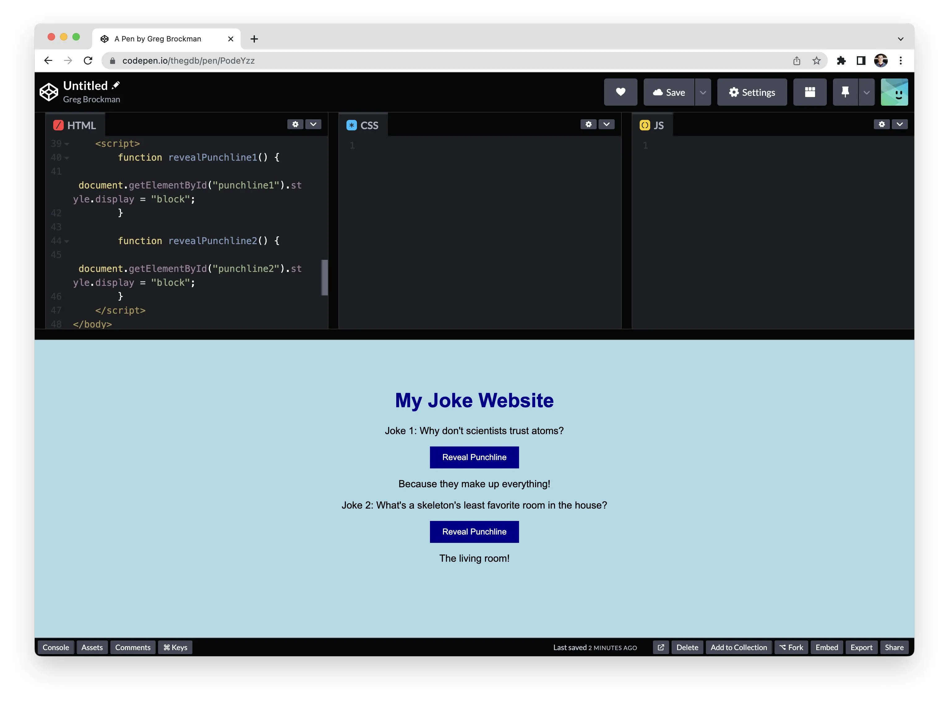 It’s for a joke website, where it shows a joke, and you push a button to reveal the punchline.